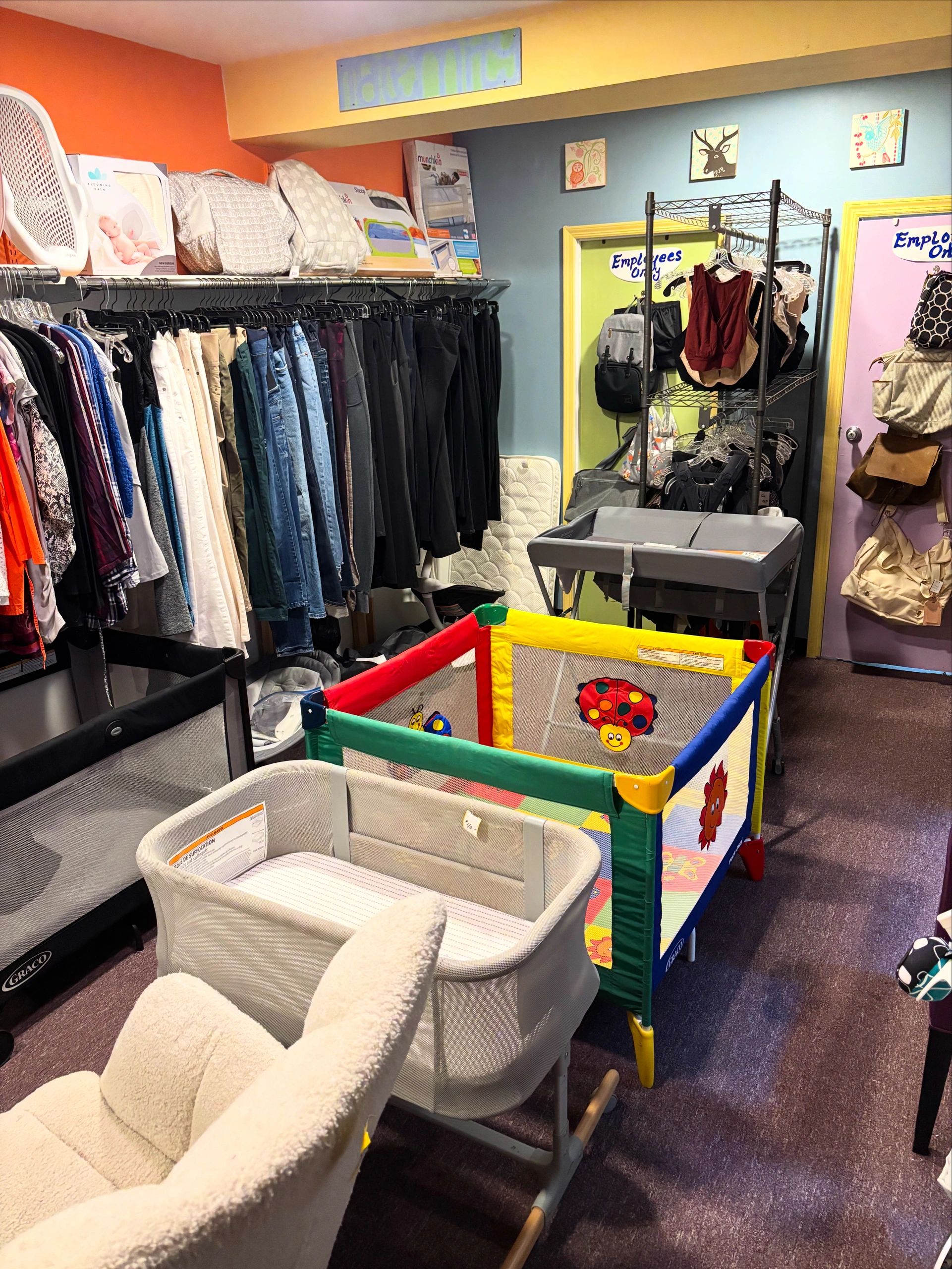 We have a large play area and book nook in the front of the store where your children can play and read safely as you make your way through our large space to freely browse shoes, gear, furniture, toys, accessories, maternity and nursing clothes. We have a small, friendly, helpful staff that will help you find exactly what you're looking